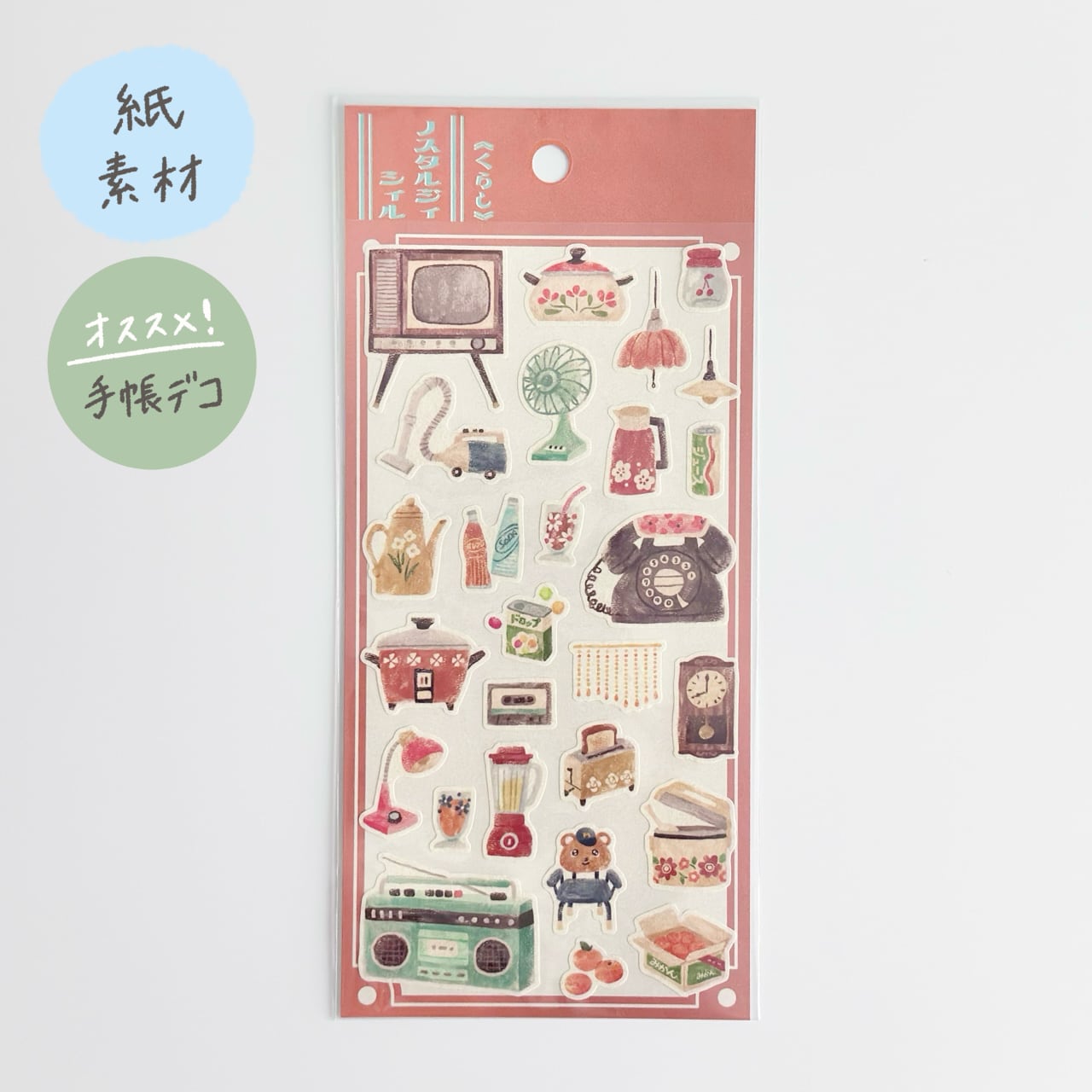 懐かしいモチーフや色合いが特徴の、レトロなシールです。