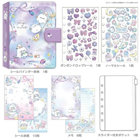 セット内容:シールバインダー本体1冊、ボンボンドロップシール1枚、ノーマルシール1枚、シール台紙10枚、メモ8枚、スライダー付きポケット1枚